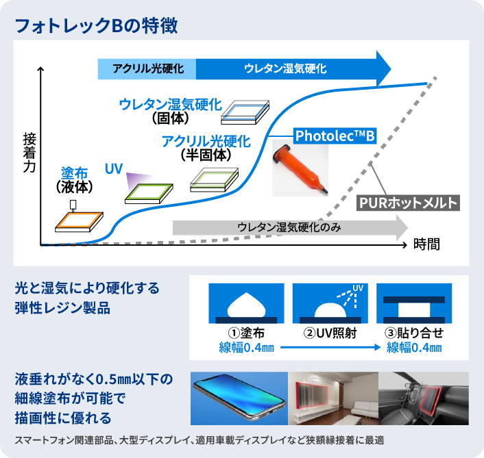 滋賀水口工場のファインケミカル製造部がHuaweiに供給しているのが「フォトレックB」と呼ばれる弾性レジン製品です。「フォトレックB」は、主にスマートフォン向けに用いられる特殊接着剤で、ゴムのように柔軟で変形後に元の形に戻る特性(弾性)があります。光と湿気の二つの要因で硬化する特性を持ち、柔軟性に優れることから、折りたたみ型スマートフォンをはじめとする最新機種にも採用されています。