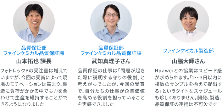 ファインケミカル品質保証課は現在6名体制で活動していますが、「フォトレックB」に関わる主な業務は、課長の山本拓也さんが統括し、品質保証担当の武知真理子さんが日常業務として顧客対応や製造ラインの安定性支援を行っています。さらに、ファインケミカル製造部に所属する山脇大輝さんが開発リーダーとなり、弾性レジン製品の設計・提案から量産立ち上げまでを開発メンバーと共に担っています。品証メンバーと開発メンバーが一丸となって「フォトレックB」の品質保証の取り組みを進めてきました。